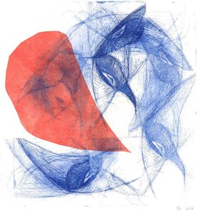 2017Ik maakte een ets in verni-mou. Daarna speelde ik met de afdruk, met ininkten of niet ininkten. Dit werk is ingekaderd in een blokkader van 50 x 50 cm.