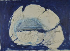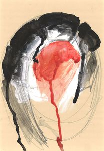 2018De tekening maakte ik heel direct en intiutief op een stuk geleefd papier. Op de foto kon ik spijtig genoeg de gekartelde, gescheurde randen niet weergeven. Deze tekening is zwevend gepresenteerd in een groot blokkader van 90 op 70 cm. Indien interesse, stuur ik u de foto's van het werk in zijn totaliteit, met kader.